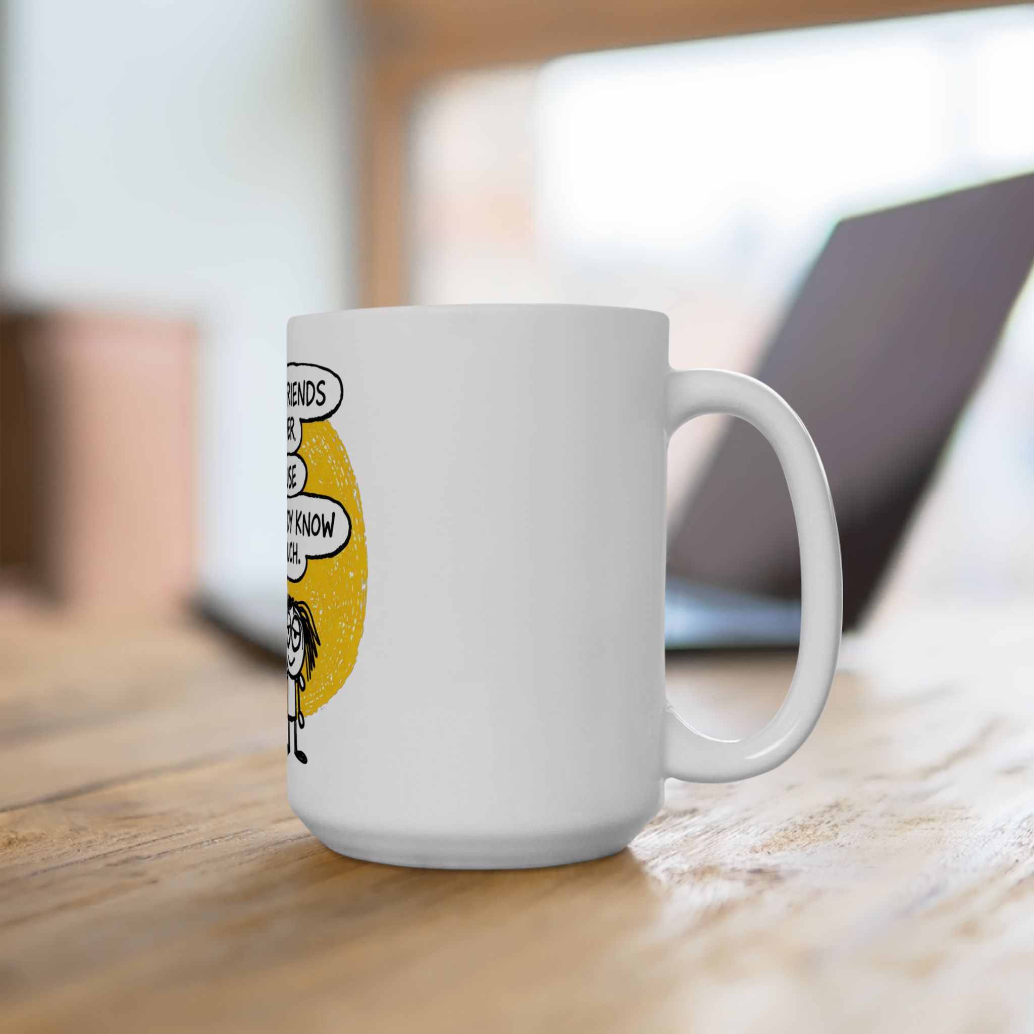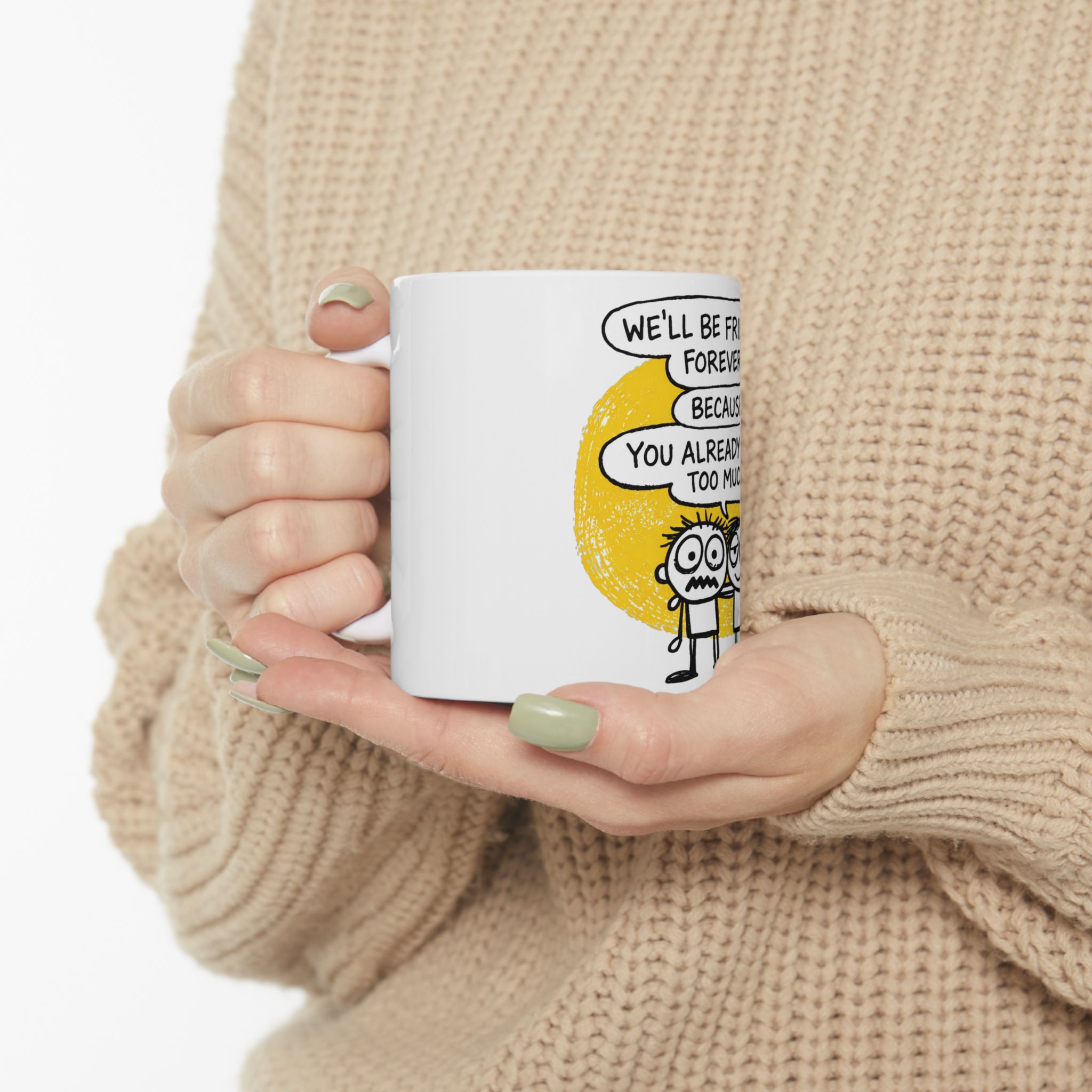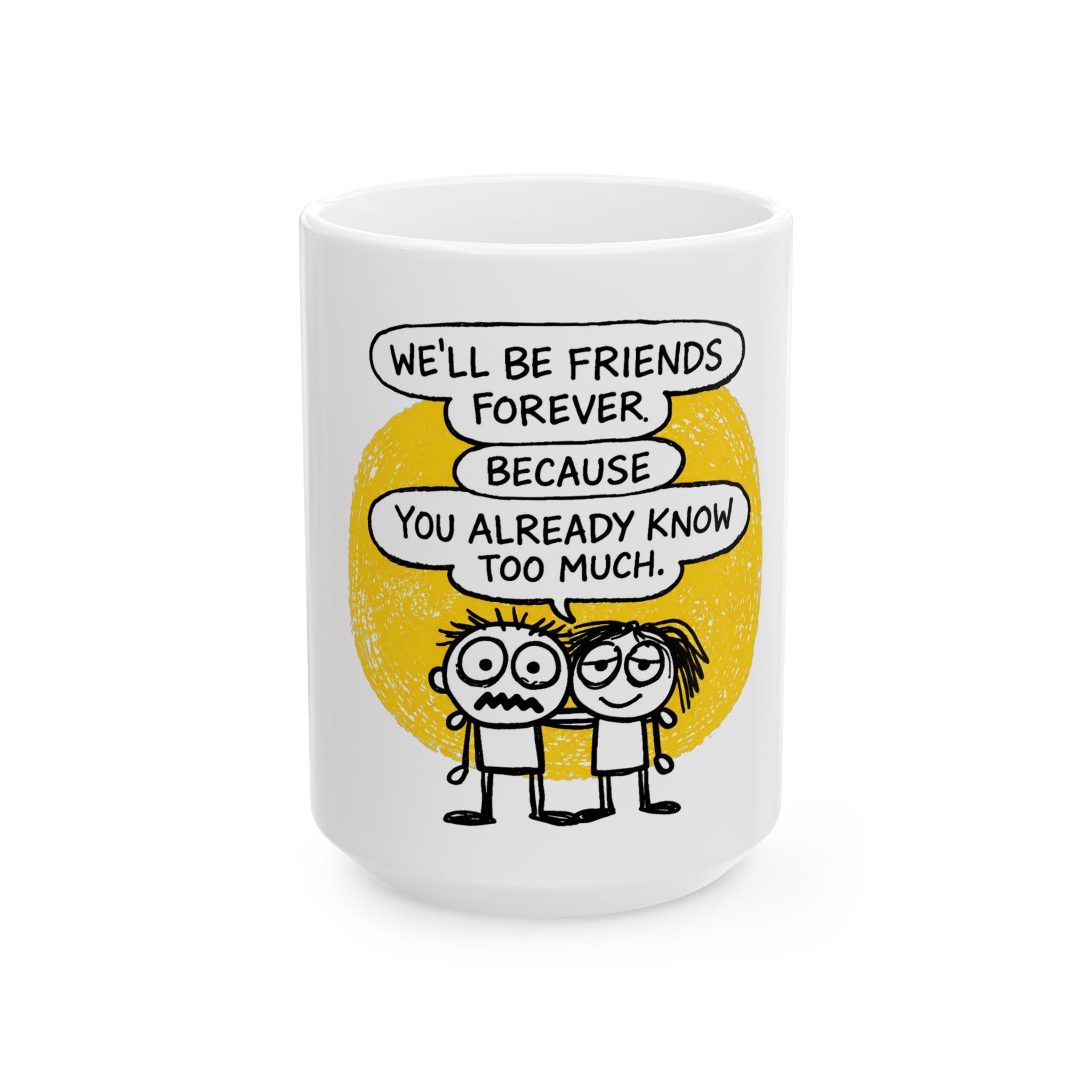 This glossy ceramic mug carries a wink-and-nudge message for the friend who’s seen your messy moments and stayed anyway. A warm yellow backdrop and playful hand-drawn characters frame the line: “We’ll be friends forever because you already know too much.” It feels like a private joke at the start of every morning — coffee, tea, or a late-night cocoa that sparks a laugh and a memory. Lightweight enough for everyday use, available in two sizes, and finished with a comfortable C-handle, it slips easily into routine and conversation. Built with vibrant prints and safe, durable materials, it holds both your drink and a little piece of shared history.